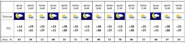 Սեպտեմբերի 24-28-ին առավելապես հյուսիսային շրջաններում տեղ-տեղ երեկոյան ժամերին և գիշերը հնարավոր է կարճատև անձրև և ամպրոպ: