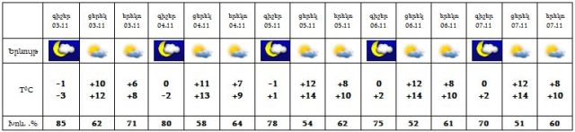 Օդի ջերմաստիճանը 3-ի գիշերը կնվազի 3-4, ցերեկը կբարձրանա 1-2 աստիճանով, 4-6-ին աստիճանաբար կբարձրանա 2-3 աստիճանով: