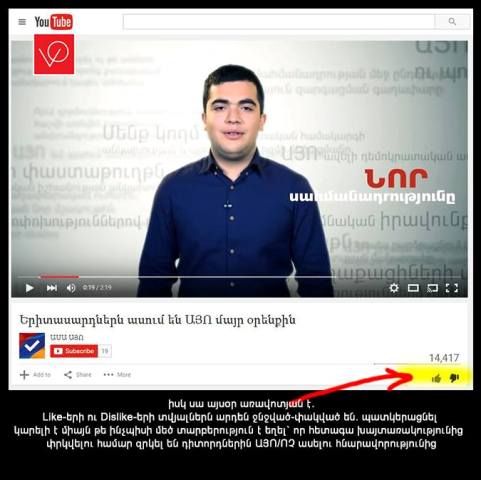 Մոտ երկու շաբաթ առաջ «Այո»-ի ճակատը «Youtube»-ում բացեց «Ասա՛ այո՛» պաշտոնական էջը, որն իր վրա ուշադրություն գրավեց ոչ թե քարոզող տեսանյութերի պատճառով, այլ սակավաթիվ հետևորդների ու «like»-երի, և չափից դուրս շատ «dislike»-ի: «Այո»-ի ներկայացուցիչները կարճ ժամանակ անց փակեցին մեկնաբանությունների բաժինը: Կարճ ժամանակ անց «Facebook» սոցիալական ցանցում հայտնվեցին «like»-երի և «dislike»-երի մասին լուսանկարներ, որտեղ երևում էր դրանց անհամամատելի թիվը՝ «dislike»–երի քանակը չափազանց շատ էր: «Youtube»-յան էջի պատասխանատուներն այսօր արդեն որոշել են թողնել միայն «like»-ի կոճակը, իսկ «dislike»-ի կոճակն անջատած է: Հետևաբար, իշխանությունը թողնում է միայն «այո» ասել. «ոչ»-ի կոճակն անջատած է: Այնուամենայնիվ, ողջ ՀՀԿ-ական կեղծ և իրական էջերով «like»-երի պակաս «Ասա՛ այո՛»-ն զգում է: