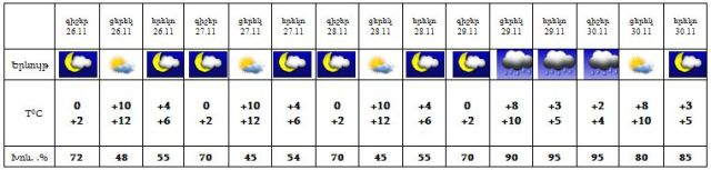 Նոյեմբերի 26-28-ին, 30-ի ցերեկը սպասվում է առանց տեղումների եղանակ, 29-ին, 30-ի գիշերը սպասվում է անձրև, հնարավոր է քամու ուժգնացում՝ 16-18 մ/վրկ: