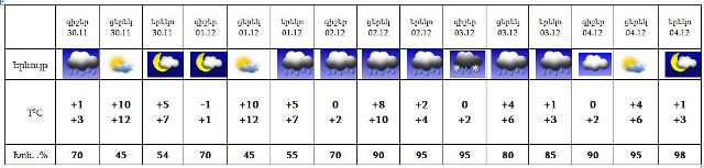 Օդի ջերմաստիճանը նոյեմբերի 30-ի ցերեկը, դեկտեմբերի 2-ի գիշերը կբարձրանա 2-3 աստիճանով, դեկտեմբերի 2-ի ցերեկը, 3-ին կնվազի 3-4 աստիճանով: