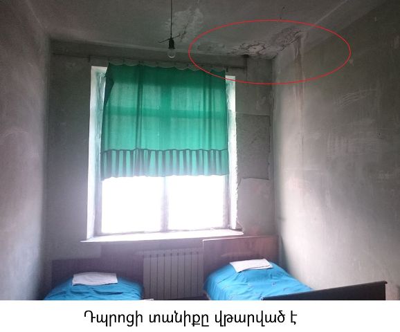 Հայտնենք նաեւ, որ դեռեւս 2014 թվականին Կրթության եւ գիտության նախարարն Օմբուդսմենին տեղեկացրել էր, որ բյուջեի պահուստային ֆոնդից գումար է հատկացվել շենքի հիմնանորոգման համար՝ նախահաշվարկներ կազմելու նպատակով: Սակայն կարող ենք միանշանակ փաստել, որ հաստատությունում առկա վիճակը շարունակում է մտահոգիչ եւ չլուծված մնալ: Միակ առաջընթացը, որ գրանցվել է մեկ տարվա ընթացքում այն է, որ այս տարի չի հայտնաբերվել ժամկետանց դեղորայք, ինչպես նաեւ մասամբ բարելավվել են դպրոցի խոհանոցային պայմանները:
