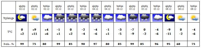 Դեկտեմբերի 3-ին ժամանակ առ ժամանակ սպասվում է ձյուն, 4-ին, 6-7-ին սպասվում է առանց տեղումների եղանակ: