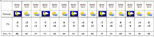 Դեկտեմբերի 24-28-ին սպասվում է առանց տեղումների եղանակ: Քամին՝ հյուսիս-արևմտյան‵ 2-7 մ/վրկ արագությամբ:
