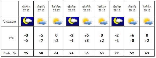 Դեկտեմբերի 27-29-ին սպասվում է առանց տեղումների եղանակ: Քամին՝ հյուսիս-արևմտյան‵ 2-7 մ/վրկ արագությամբ: Օդի ջերմաստիճանը էական չի փոխվի: