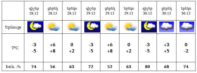 Դեկտեմբերի 28-30-ին սպասվում է առանց տեղումների եղանակ: Քամին՝ հյուսիս-արևմտյան‵ 2-7 մ/վրկ արագությամբ: