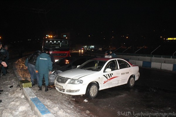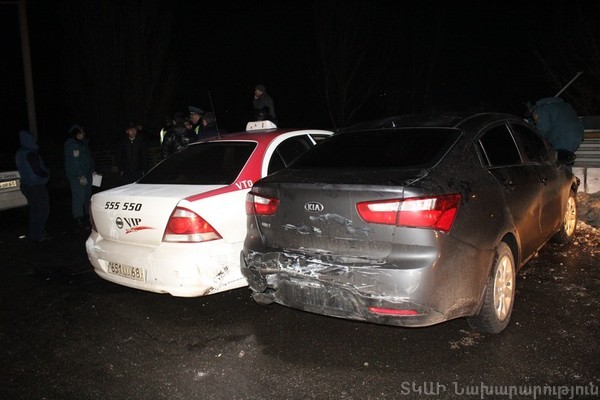 Պարզվել է, որ դեռևս չբացահայտված հանգամանքներում բախվել են «Կիա Ռիո» մանկիշի (վարորդ`1991թ ծնված Վ. Ջ.) 045ՏՏ60 պ/հ, «ՎԻՊ» տաքսի ծառայությանը պատկանող «Նիսան Սանի» մակնիշի (վարորդ` 1968թ. ծնված Հ. Ա՚) 651 LS 68 պետհամարանիշի, «Նանա» տաքսի ծառայությանը պատկանող «Դեյվու» մակնիշի (վարորդ` 1987թ. ծնված Կ. Գ.) 085 OP 61 պետհամարանիշի և «Մերսեդես E320» մակնիշի (վարորդ` 1990թ. ծնված Ա. Մ.) 34 CT 412 ավտոմեքենաները. տուժածներ չկան: