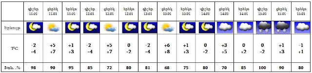 Հունվարի 11-14-ին սպասվում է առանց տեղումների եղանակ: 15-ին սպասվում է ձյուն: