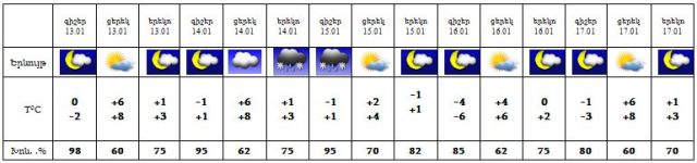 Հունվարի 13-ին, 14-ի գիշերը, 15-ի ցերեկը, 16-17-ին սպասվում է առանց տեղումների եղանակ, 14-ի երեկոյան ժամերին և 15-ի գիշերը սպասվում է ձնախառն անձրև: