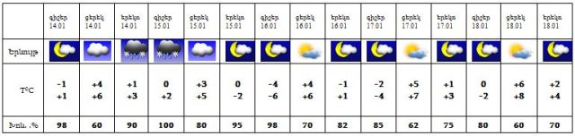 Հունվարի 14-ի գիշերը, 15-ի ցերեկը, 16-17-ին սպասվում է առանց տեղումների եղանակ, 14-ի երեկոյան ժամերին և 15-ի գիշերը սպասվում է ձնախառն անձրև: