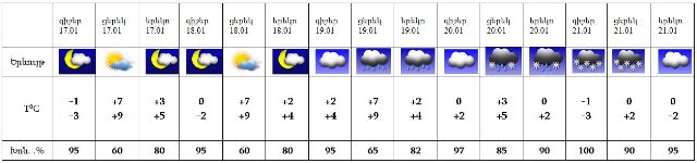 Հունվարի 17-18-ին սպասվում է առանց տեղումների եղանակ, 19-21-ին ժամանակ առ ժամանակ սպասվում են տեղումներ: