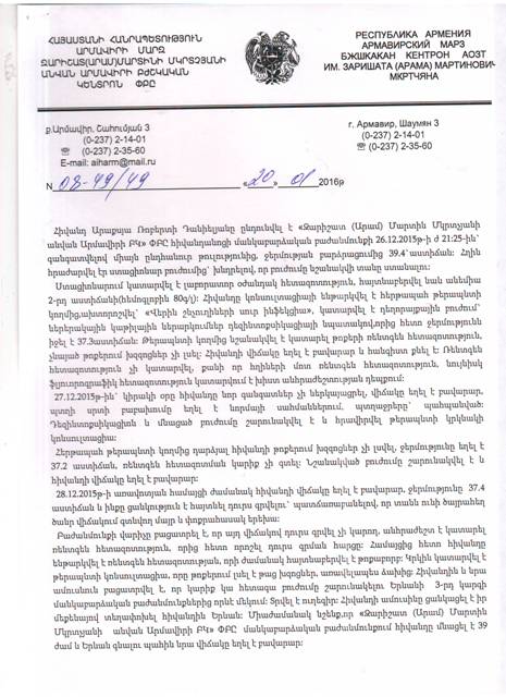 «Հիվանդ Արաքսյա Ռոբերտի Դանիելյանը ընդունվել է «Զարիշատ (Արամ) Մարտին Մկրտչյանի անվան Արմավիրի ԲԿ» ՓԲԸ հիվանդանոցի մանկաբարձական բաժանմունք 26.12.2015թ. ժամը 21:25-ին` գանգատվելով միայն ընդհանուր թուլությունից, ջերմության բարձրացումից՝ 39.4 աստիճան: Հղին հրաժարվել էր ստացիոնար բուժումից` խնդրելով, որ բուժումը նշանակվի տանը ստանալու: