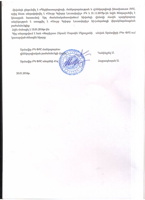 Կից տեղադրվում է նաև «Զարիշատ (Արամ) Մարտին Մկրտչյանի անվան Արմավիրի ԲԿ» ՓԲԸ-ում կատարված ռենտգեն նկարը: