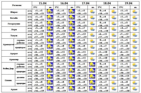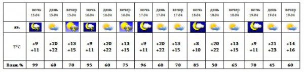 С 15-16-го апреля в основном ночью и во второй половине дня ожидается кратковременный дождь с грозой. Во время грозы возможно усиление ветра до 18-20 м/с. С 17-19 ожидается погода без осадков.