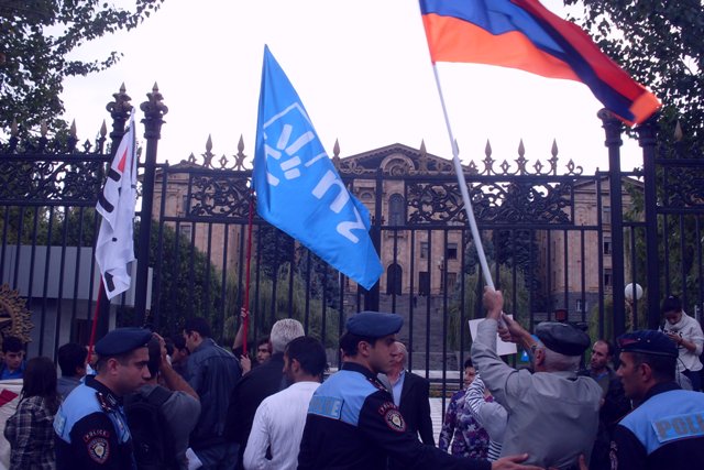 По завершении шествия перед зданием НС произошло столкновение между демонстрантами и полицейскими, которые попытались сорвать прикрепленный к ограждению НС плакат с надписью «Нет!». После потасовки полицейские сняли и разорвали его.